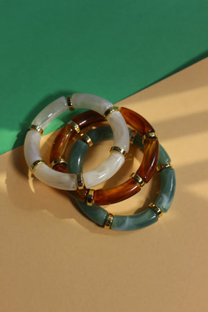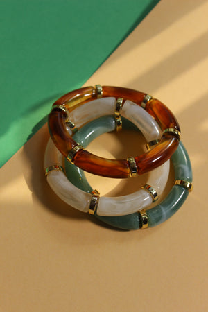 A cheerful stack of tones that wrap the wrist like a warm hug. These glossy bangles come in a curated mix of soft and bold colors - playful, easy, and made to be worn together.