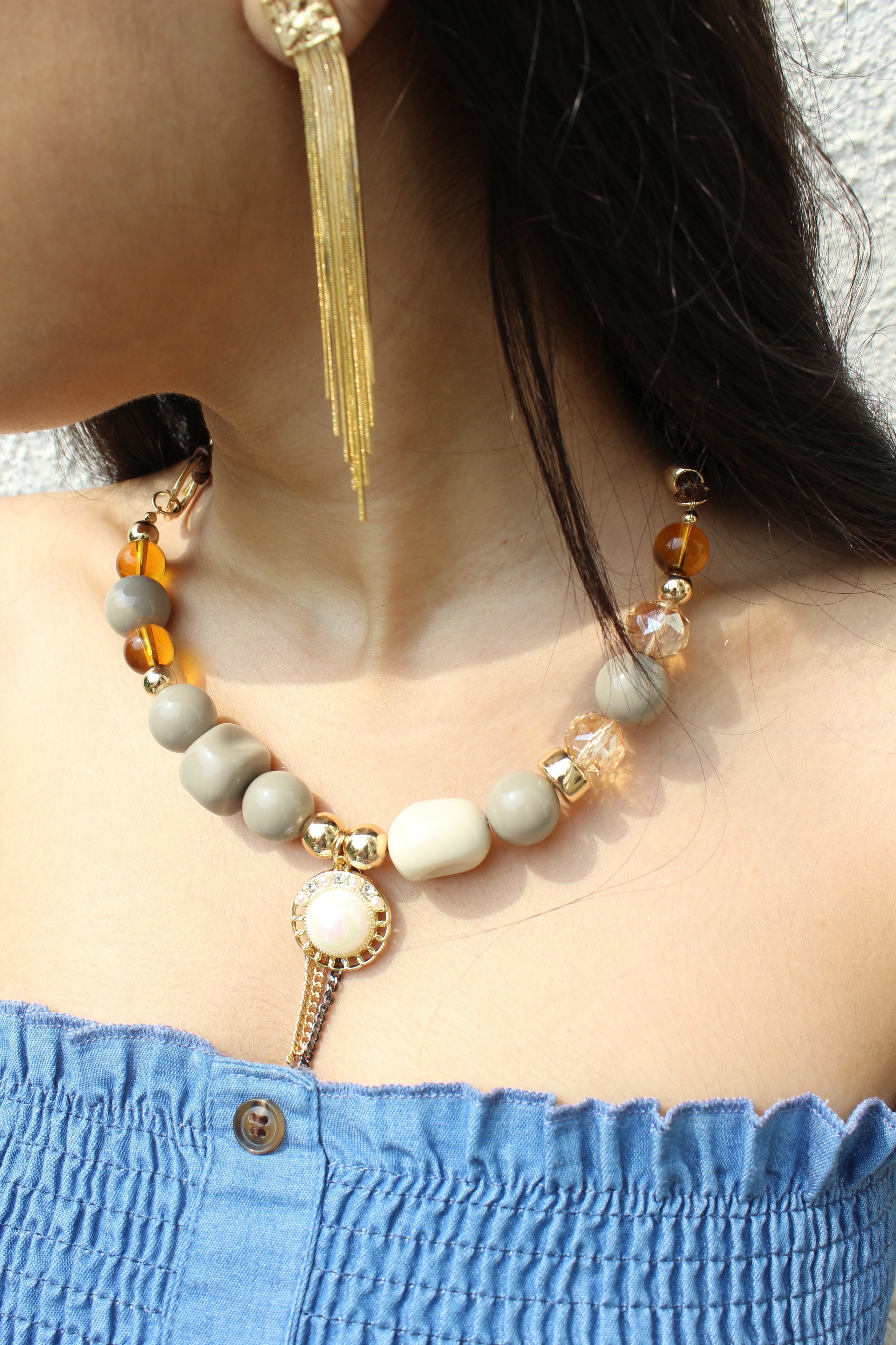 Styling Tip: Pair it with solid tops or off-shoulder styles to highlight the center pendant, or keep the rest of your jewelry minimal for a clean statement look.
