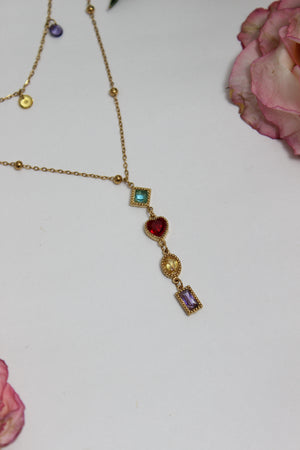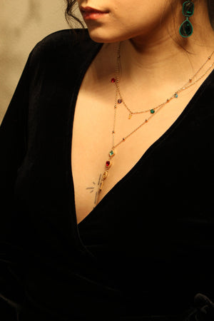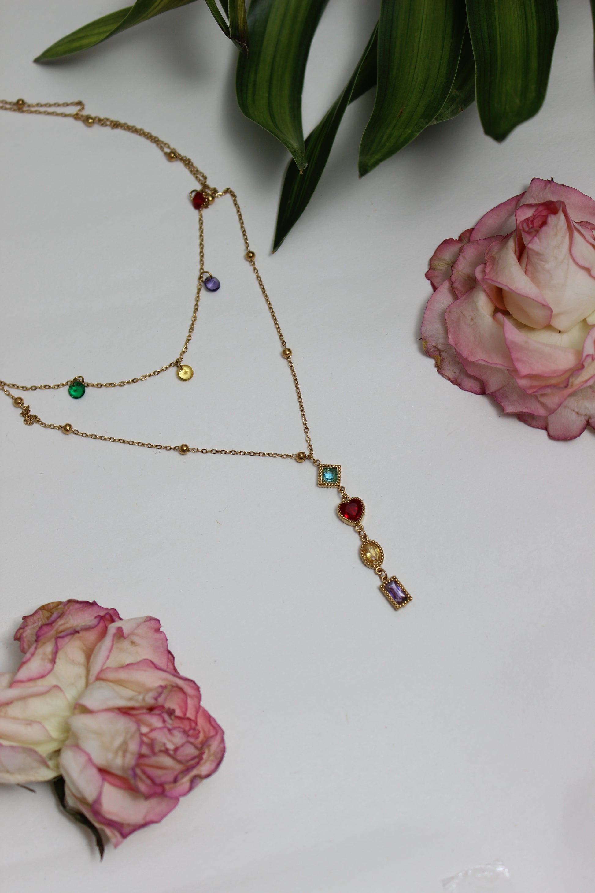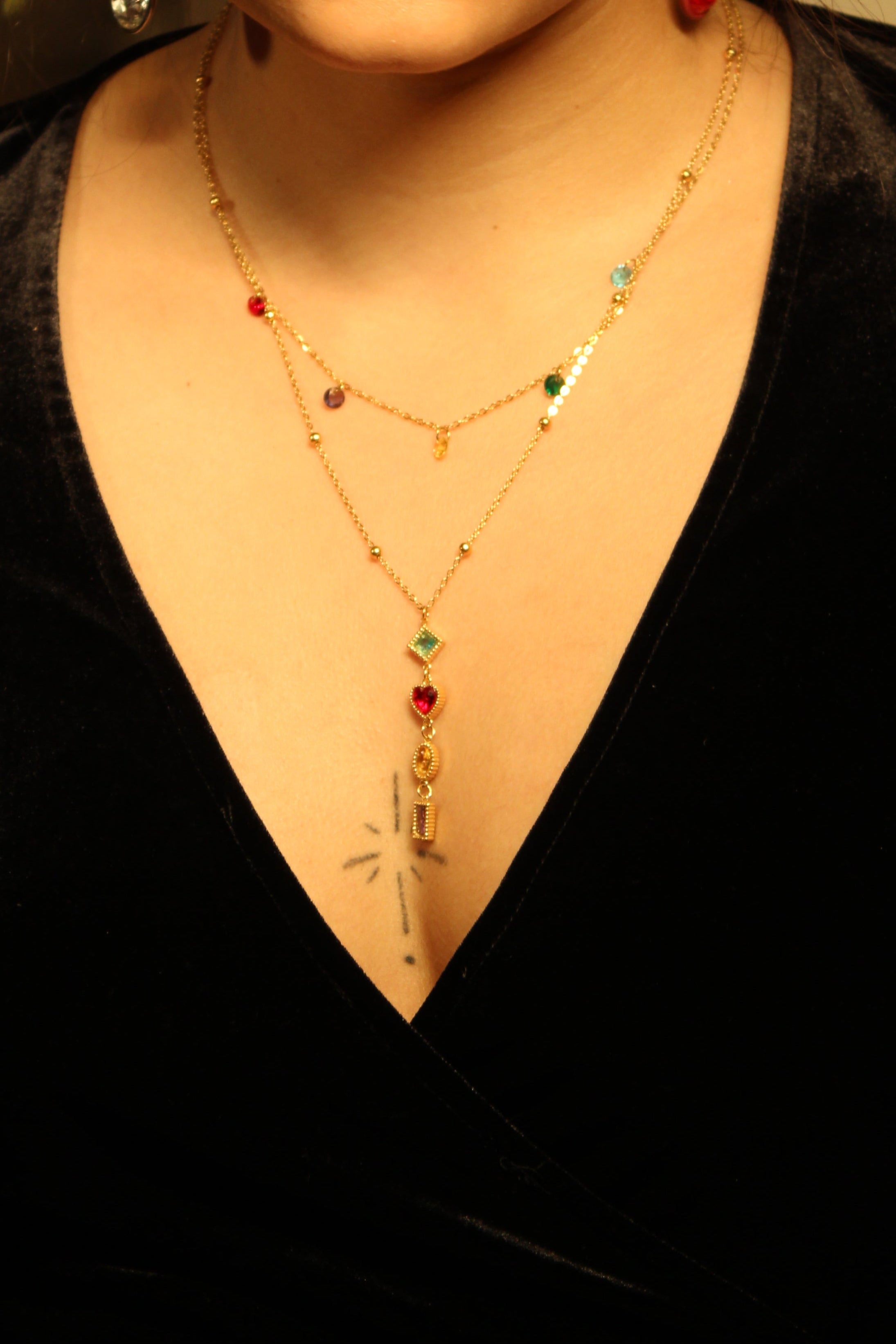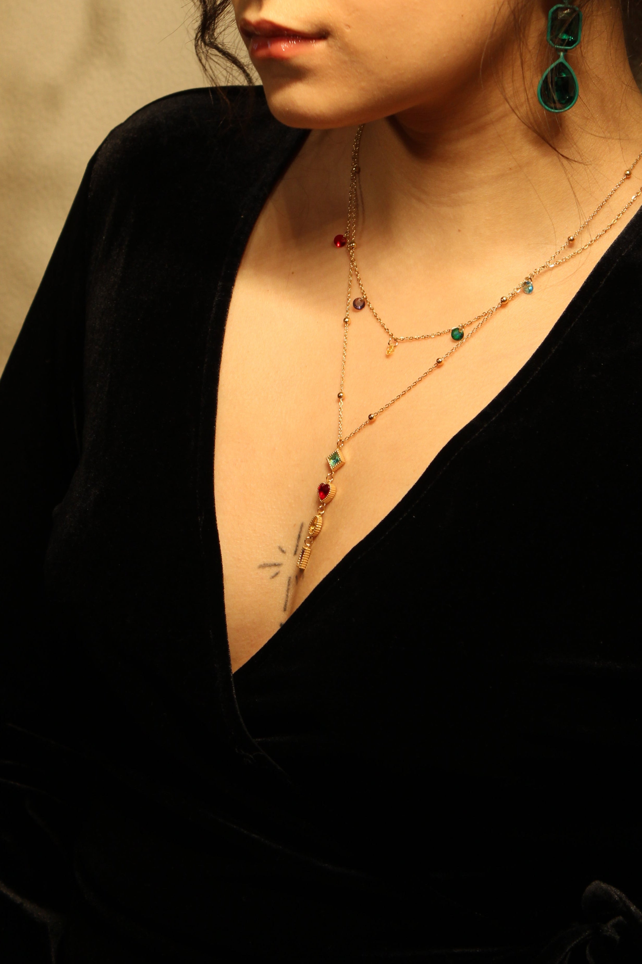 A playful cascade of colors meets a sleek layered design, creating a necklace that’s bold yet effortless. With its rich accents and fluid tiers, this piece is made to light up your look with energy and style.