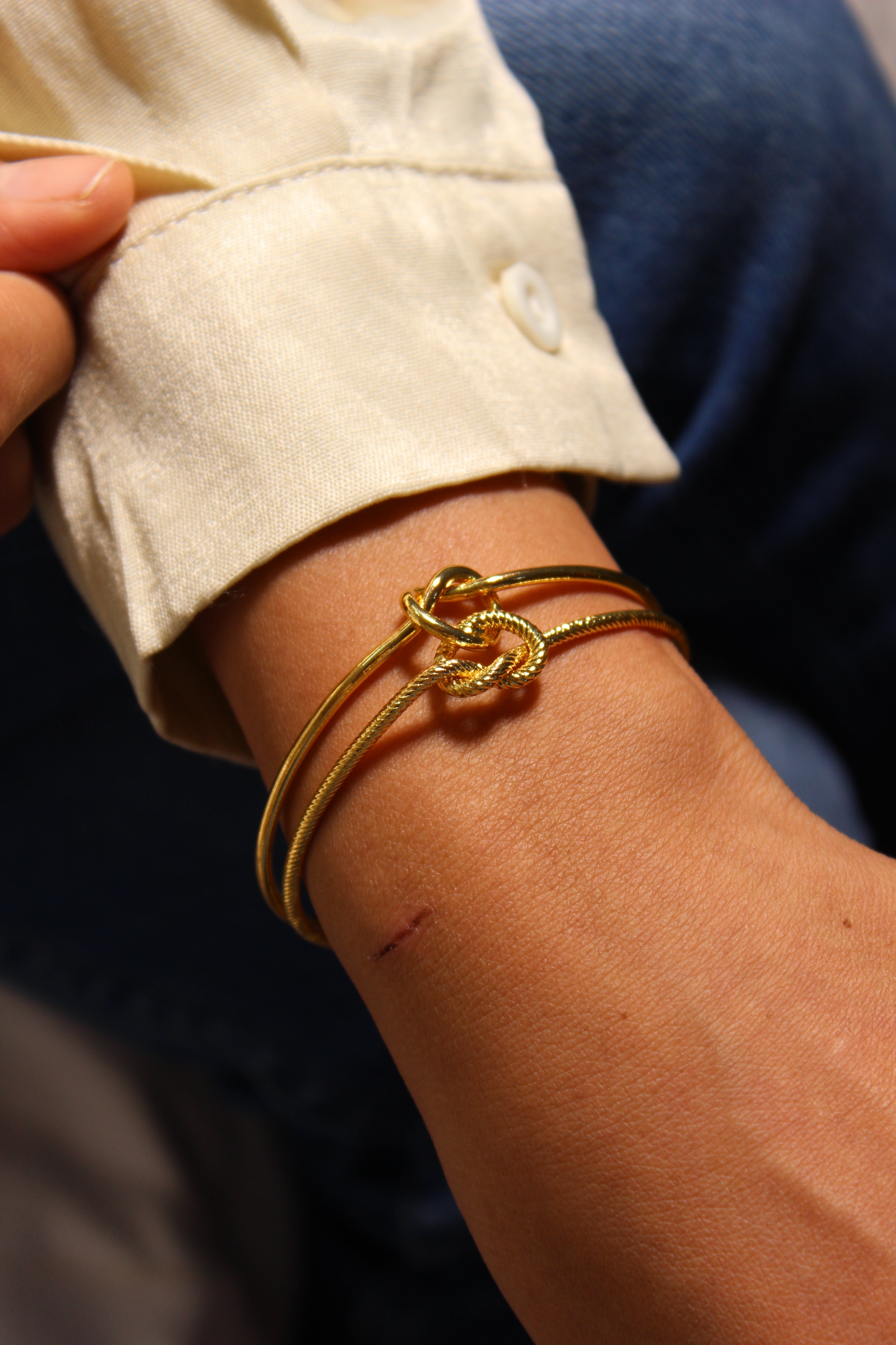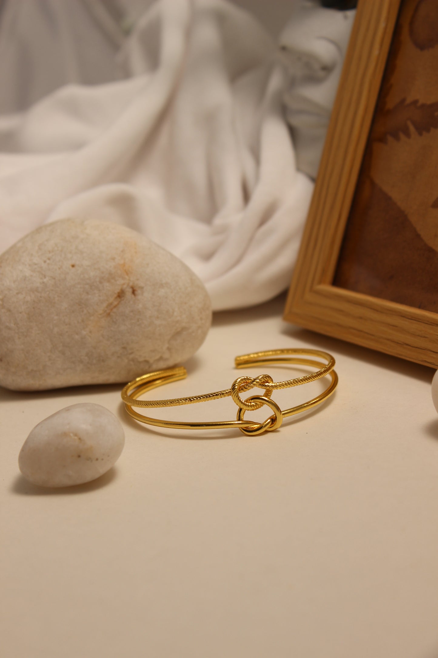 Timeless and sculptural, the Eterna Knot Cuff Bracelet weaves gold lines into a striking knot design. Its polished curves create a bold yet elegant statement, symbolizing continuity and style that endures.