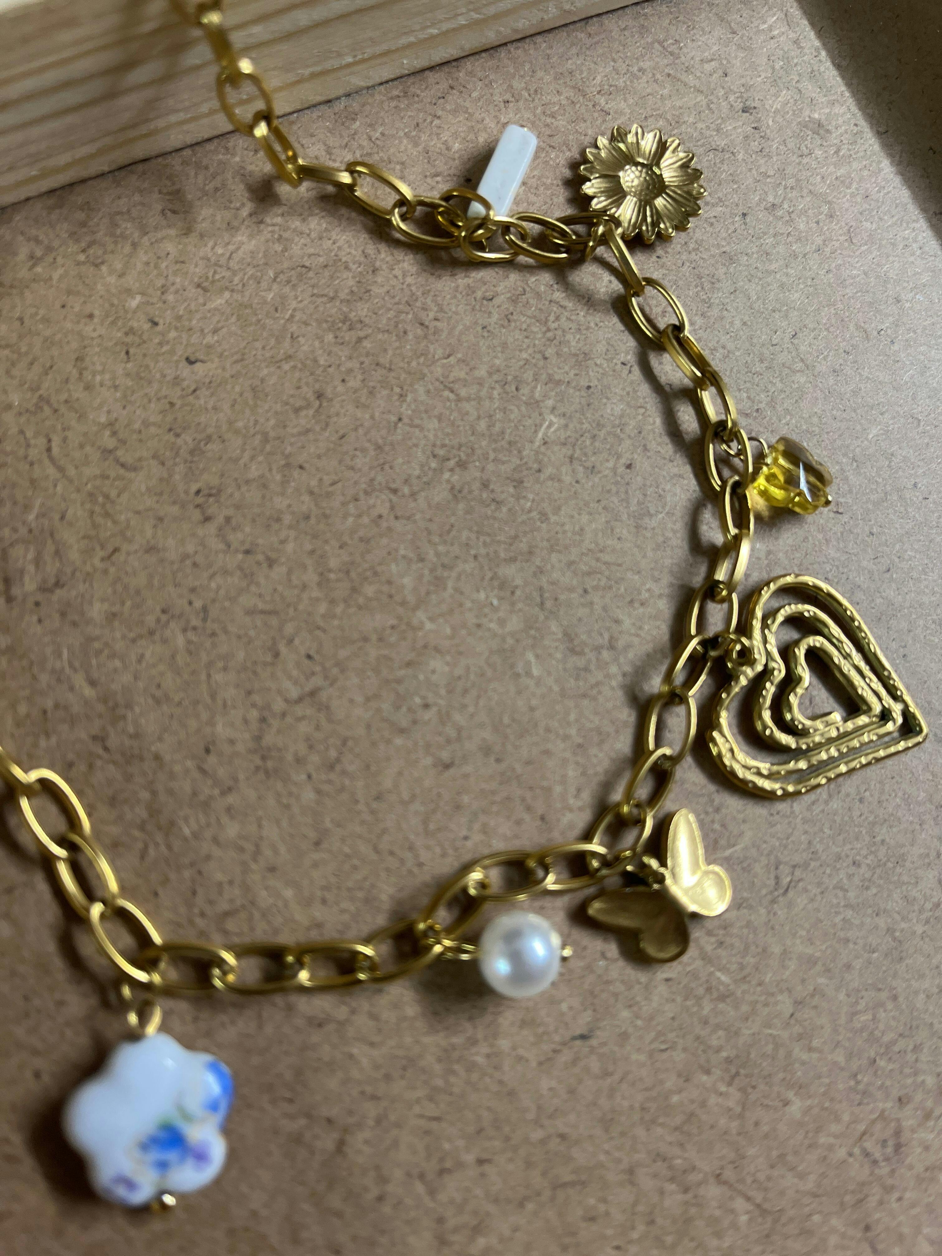 Hearts in Bloom tells a soft, playful story with seven whimsical charms dancing gently from a golden chain.