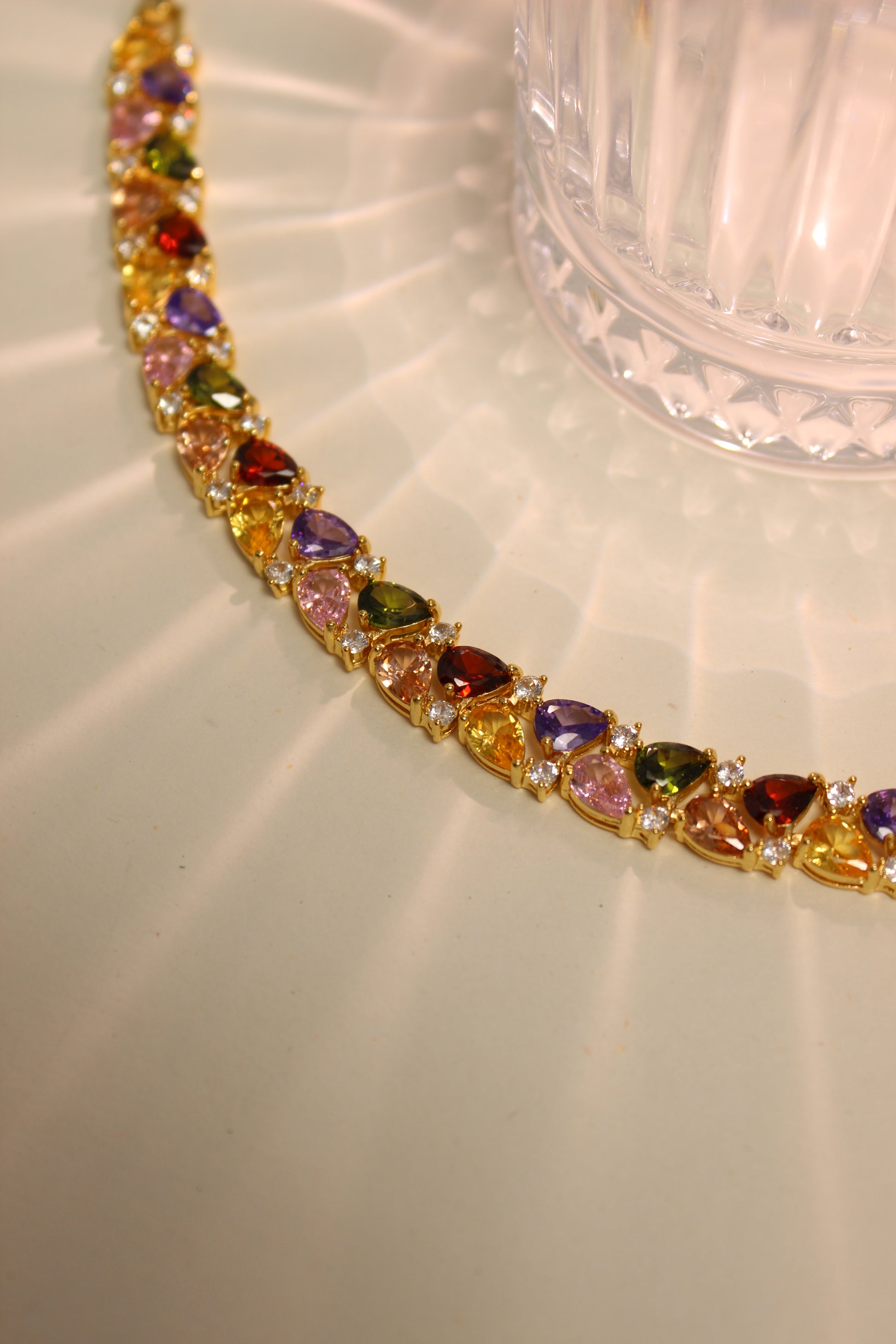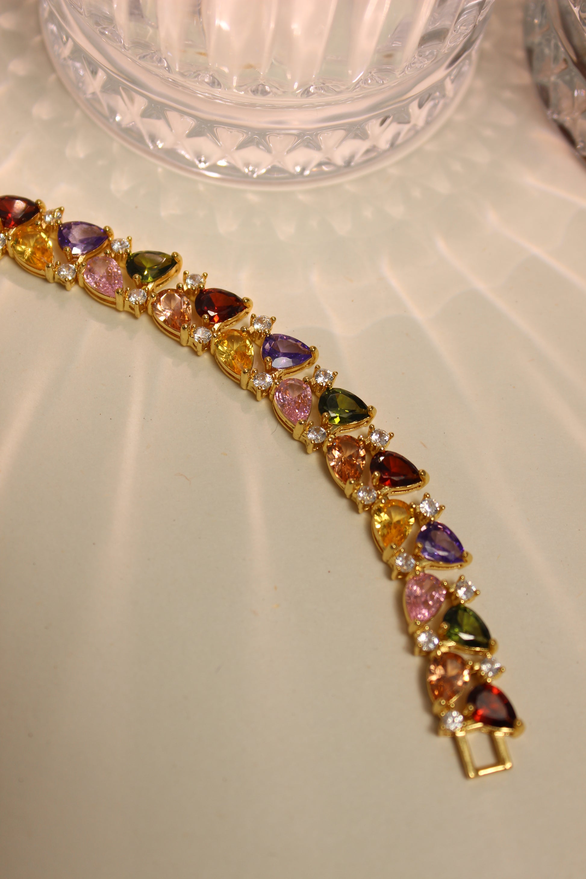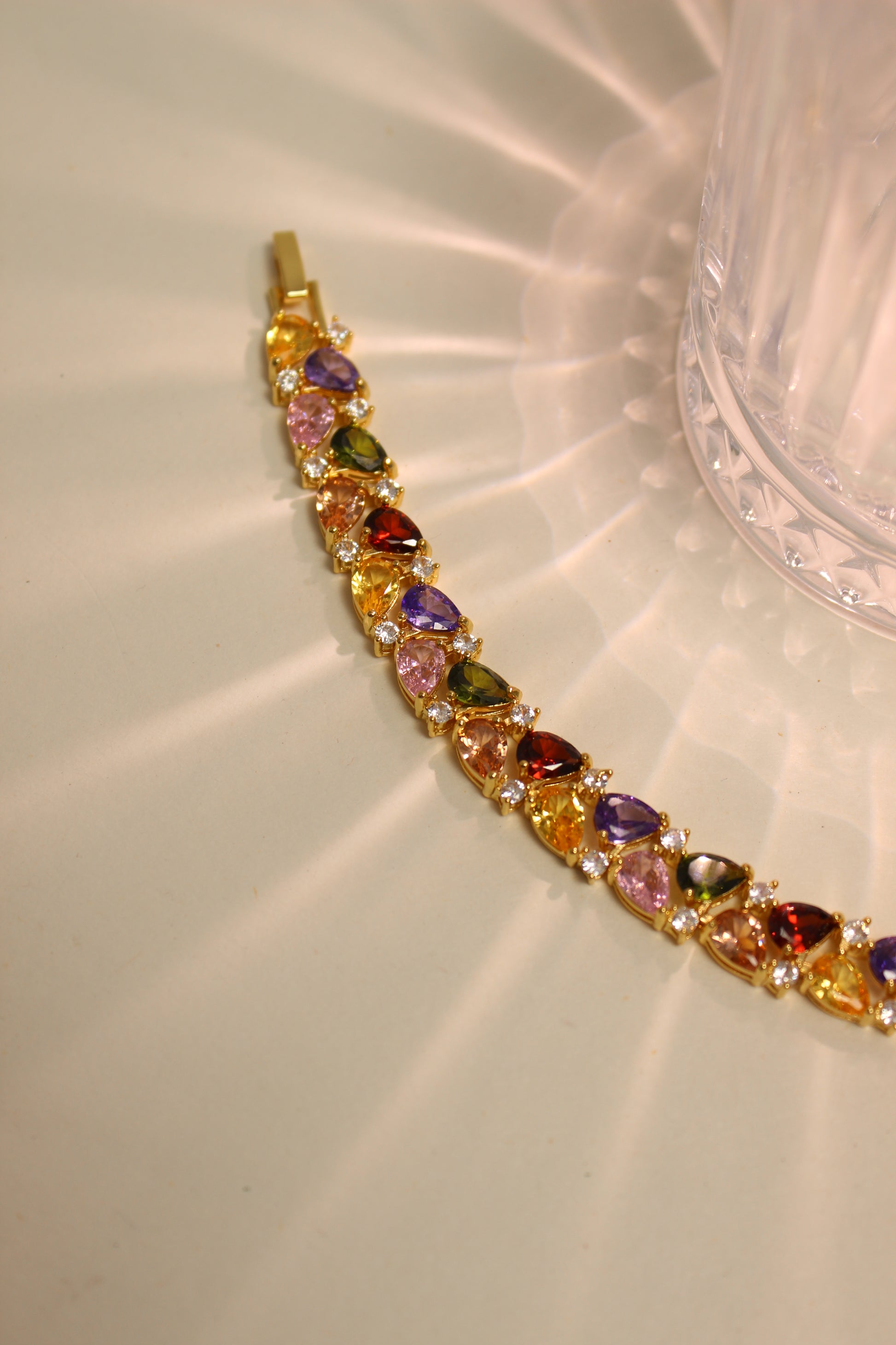 This bracelet brings together intricate jewel-like accents arranged in a harmonious flow, creating a mosaic of texture and brilliance. Balanced and vibrant, it’s a piece that feels both playful and refined.