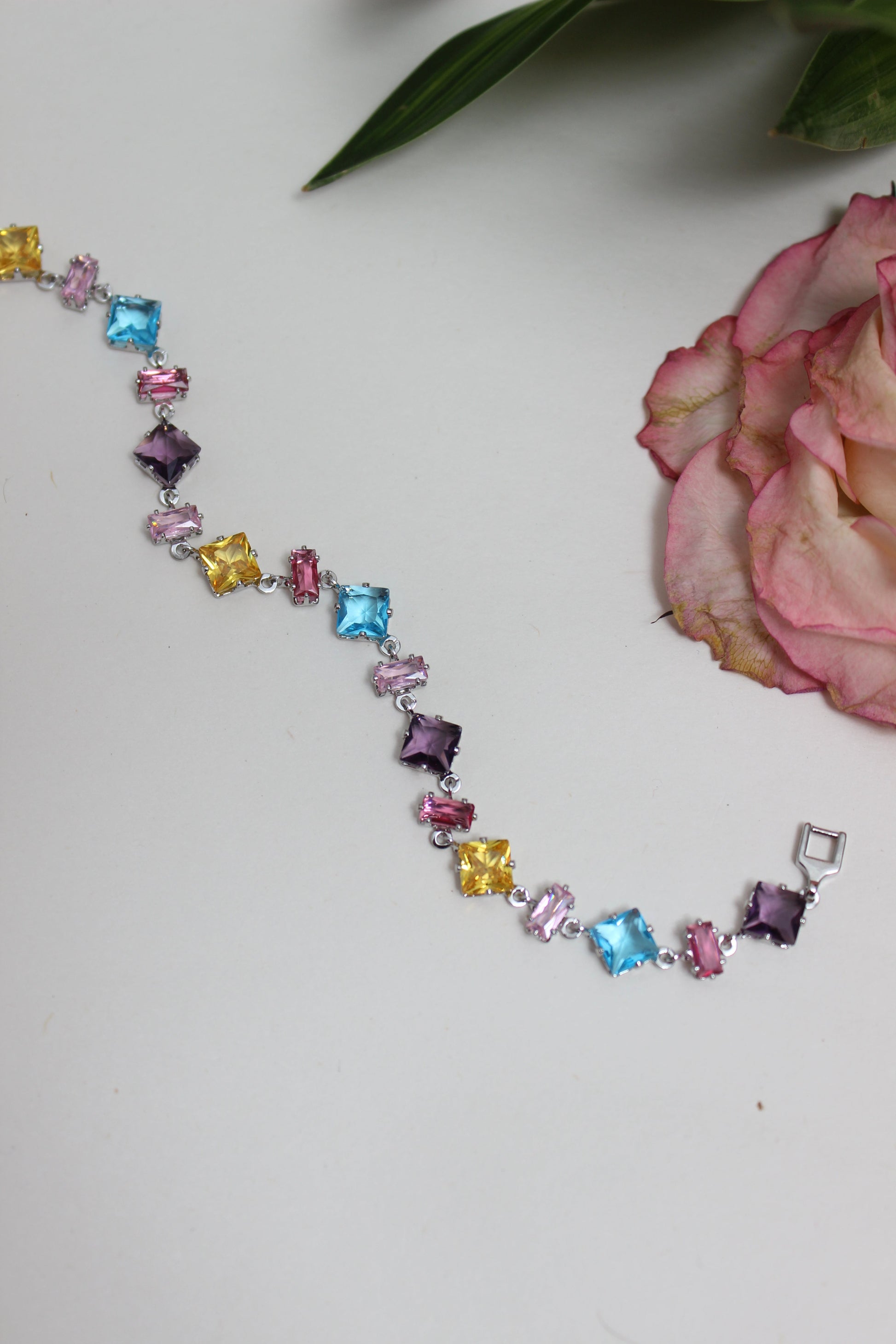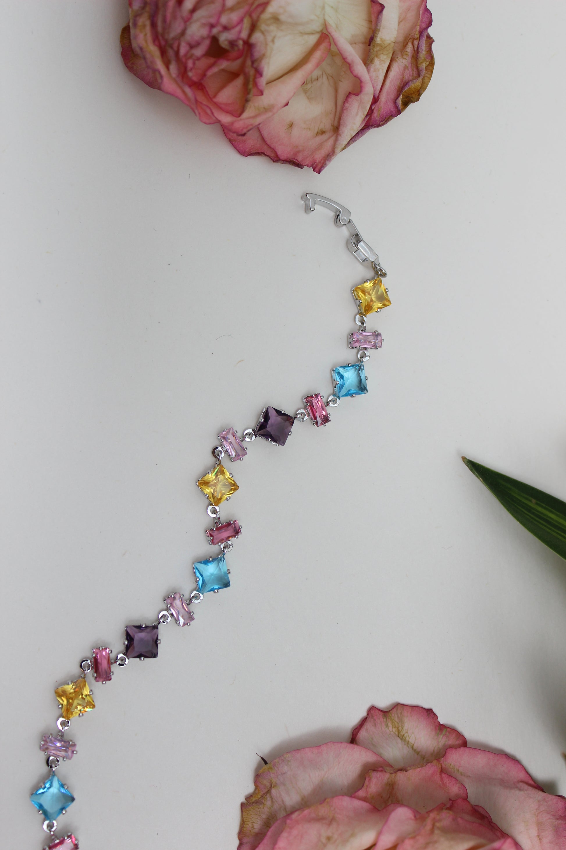 This bracelet features jewel-like accents arranged in a structured, interlocking pattern reminiscent of a mosaic. Bold yet refined, it adds a modern pop of color and personality to any outfit.