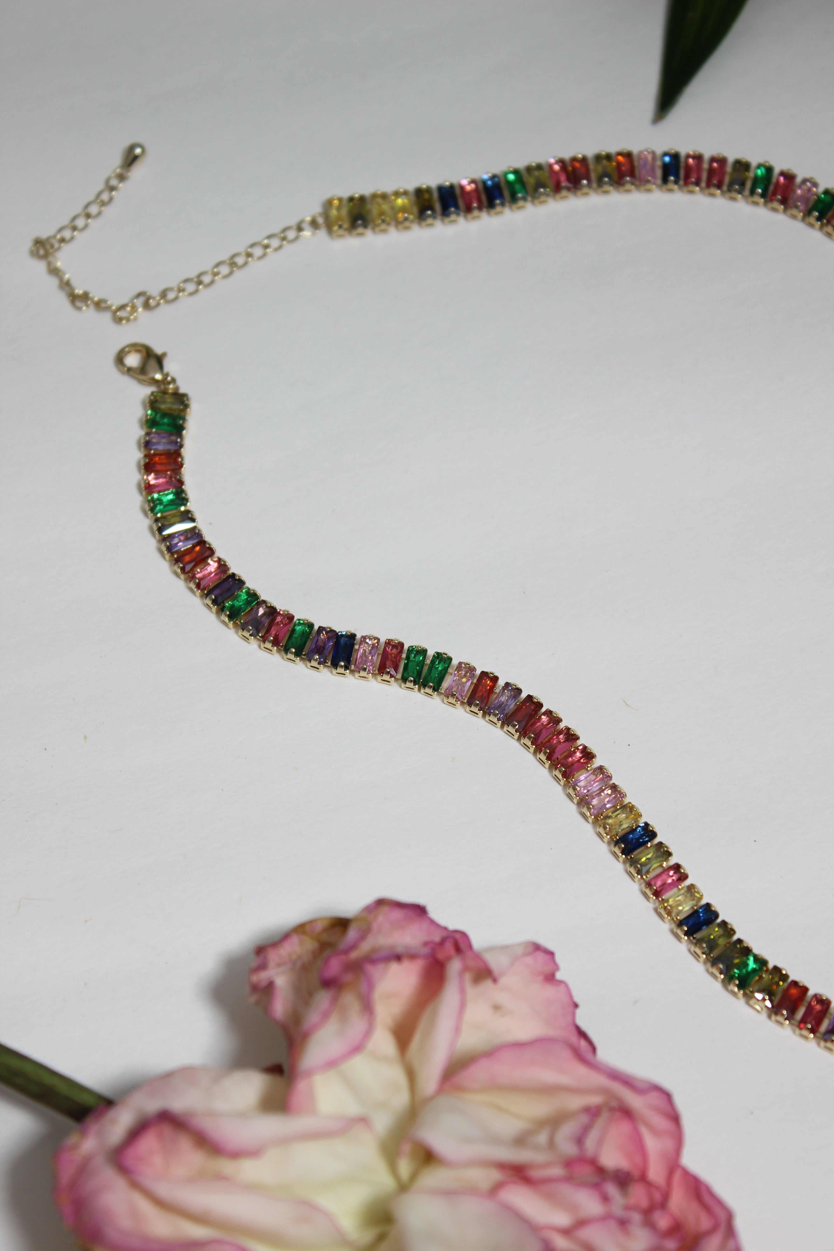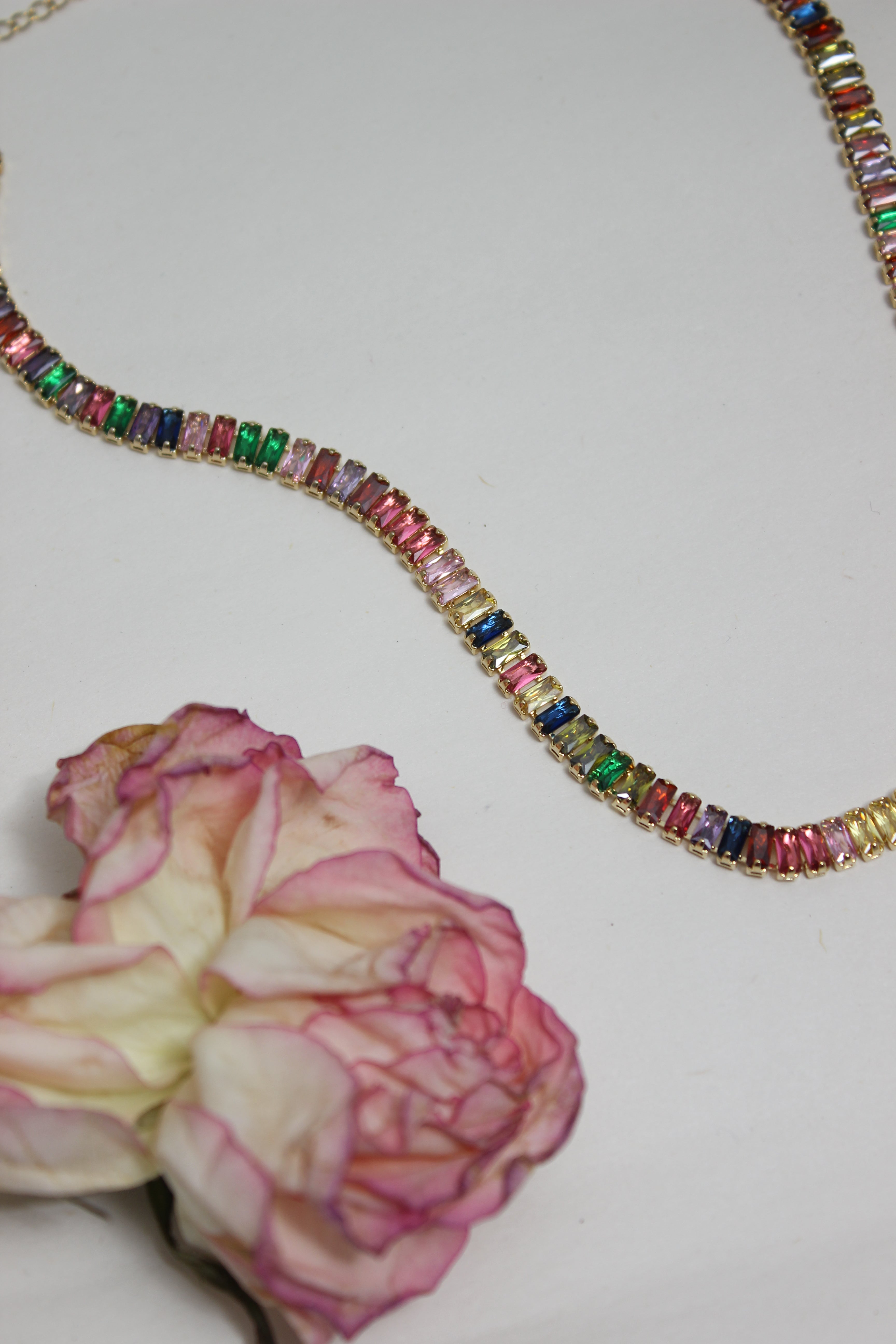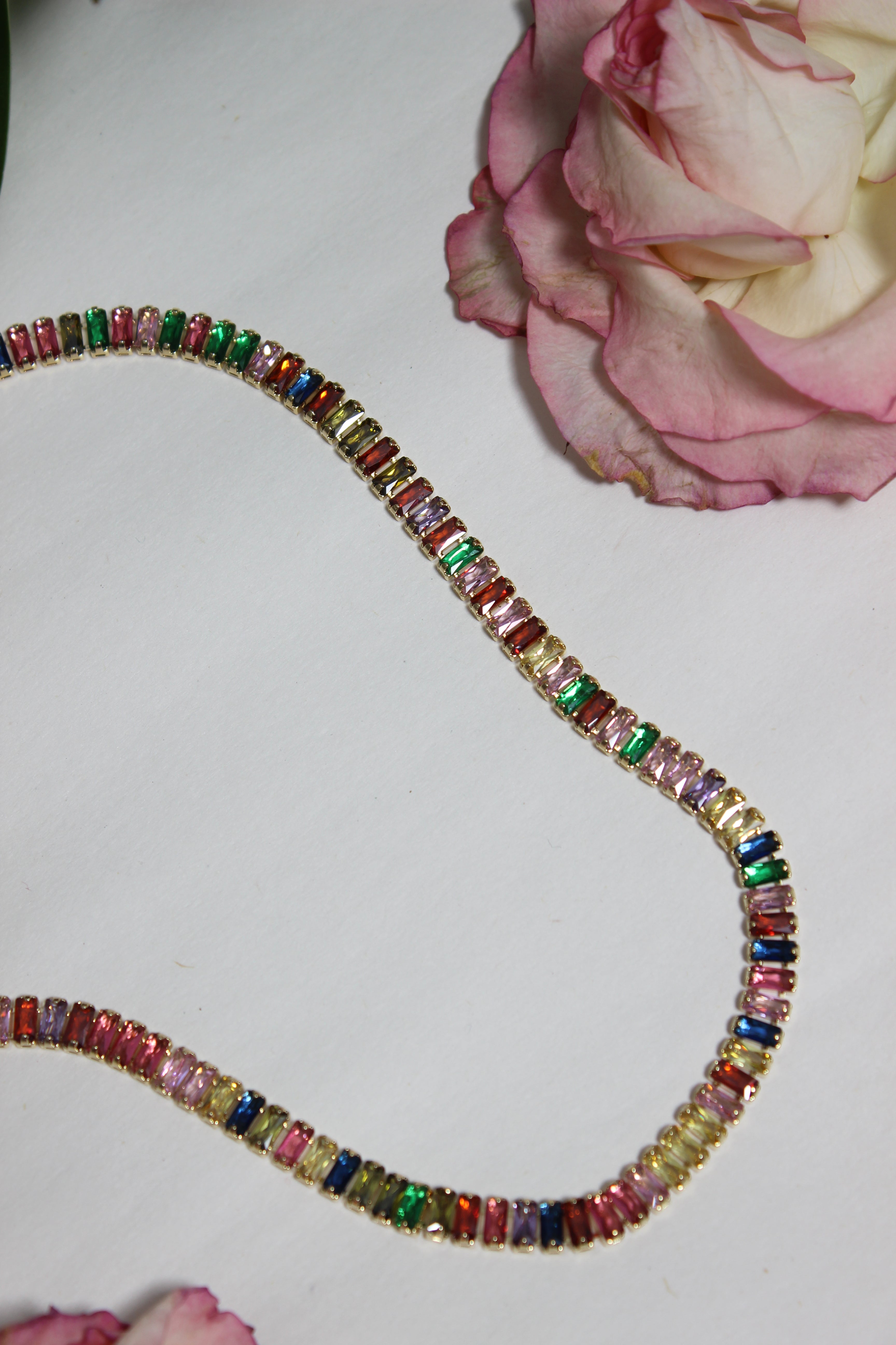 Jeweltone Parade is a vibrant take on the classic tennis necklace with sleek baguette-cut stones in rich, varying hues lined up in perfect symmetry. Clean, structured, and undeniably fun, it’s made to stand out without trying.