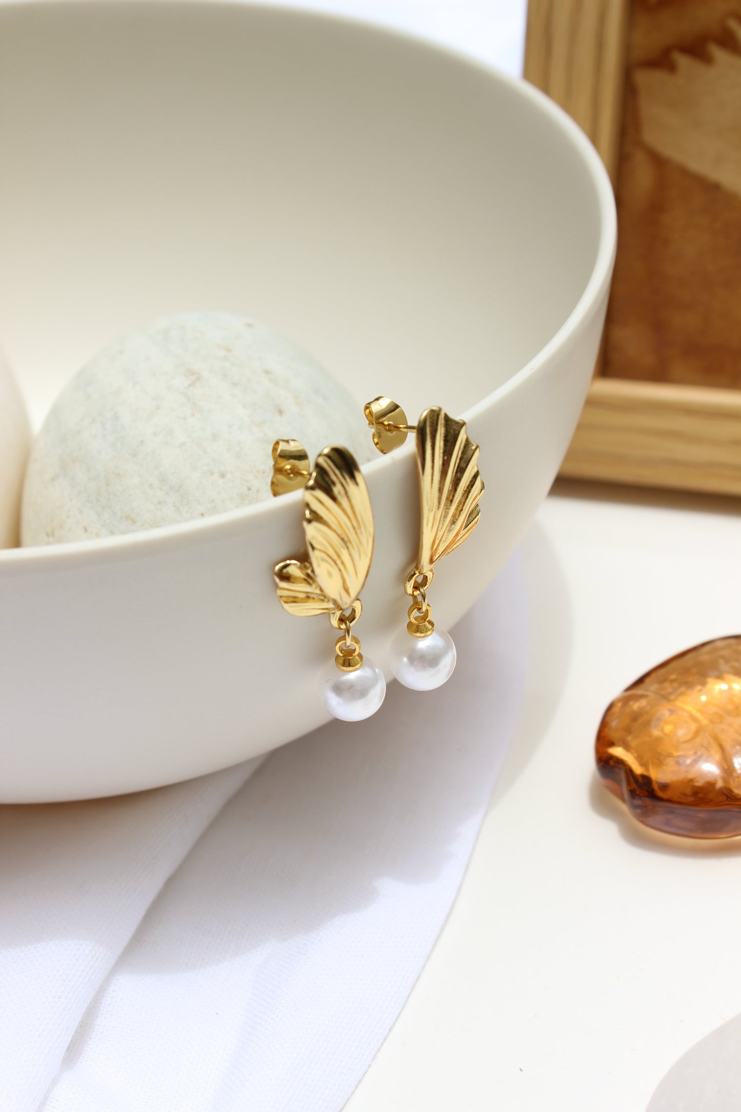 Drops of moonlight captured in gold and pearl, these earrings blend fluid curves with radiant shimmer - a celestial touch to any look.