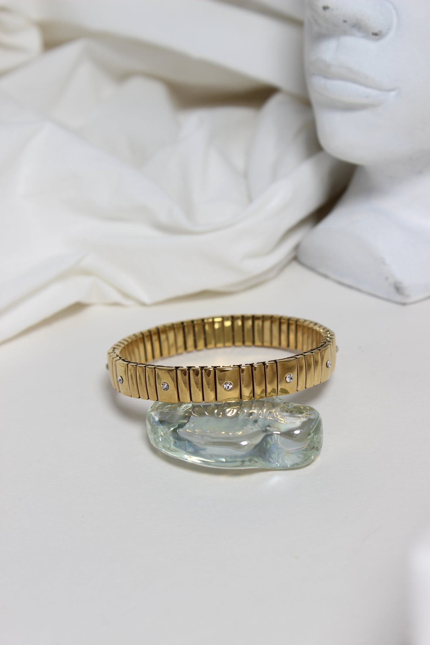 A sleek bracelet adorned with diamond-like studs at intervals, catching the light with every move. Its minimal yet striking design makes it a versatile piece that elevates any look, day or night.