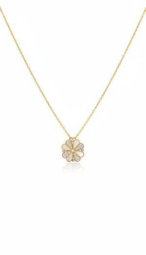 A hidden bloom revealed - this pendant begins as a clover, gently unfolding into four delicate petals around a radiant pearl. A quiet transformation, held in gold.