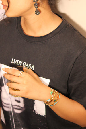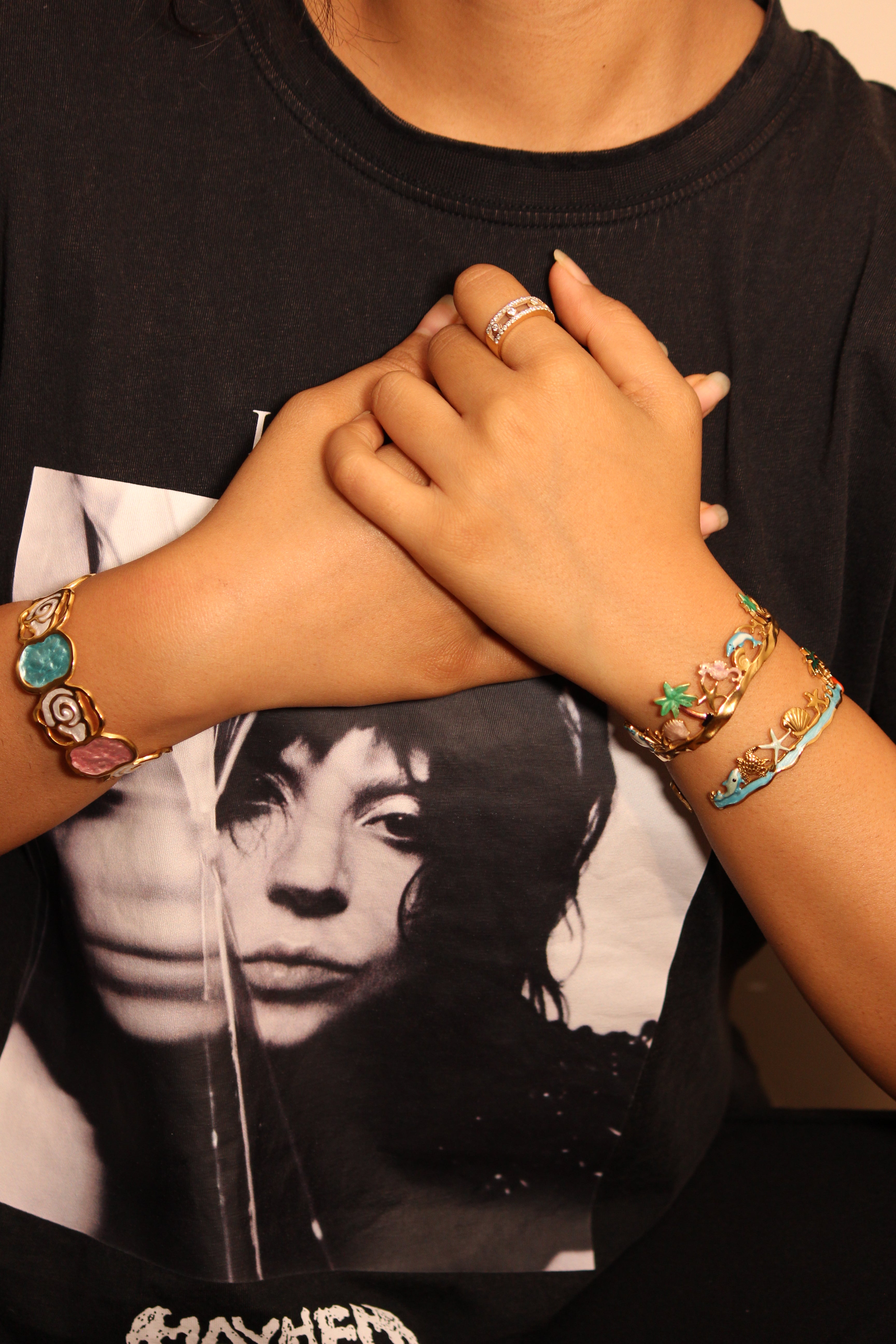 A melody of the coast captured in gold - this cuff bracelet is adorned with textured, wave-like patterns and subtle, colorful accents that echo the rhythm of the shoreline. Its design feels like the meeting point of sunlight and sea spray, evoking memories of endless summer tides.